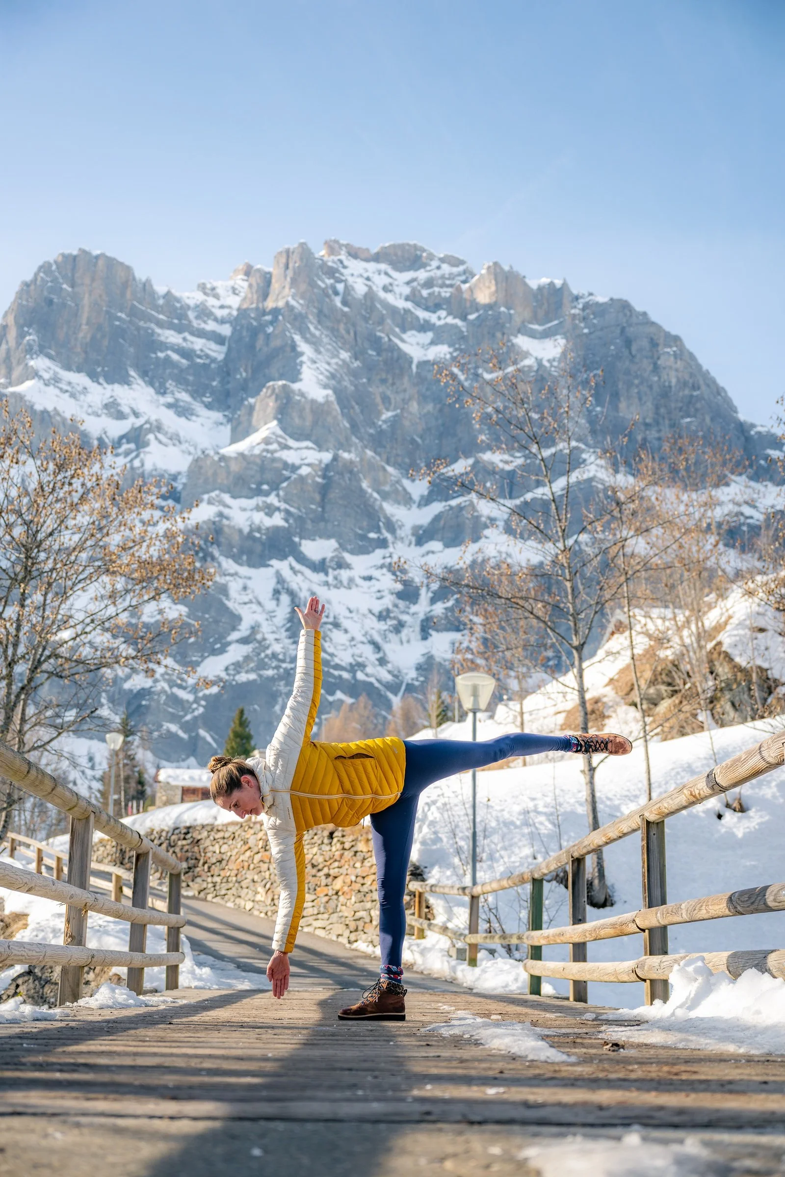 Yoga unter freiem Himmel und im Schnee. Geniesse eine Stunde Yoga in der Natur mit spektakulärer Aussicht.
